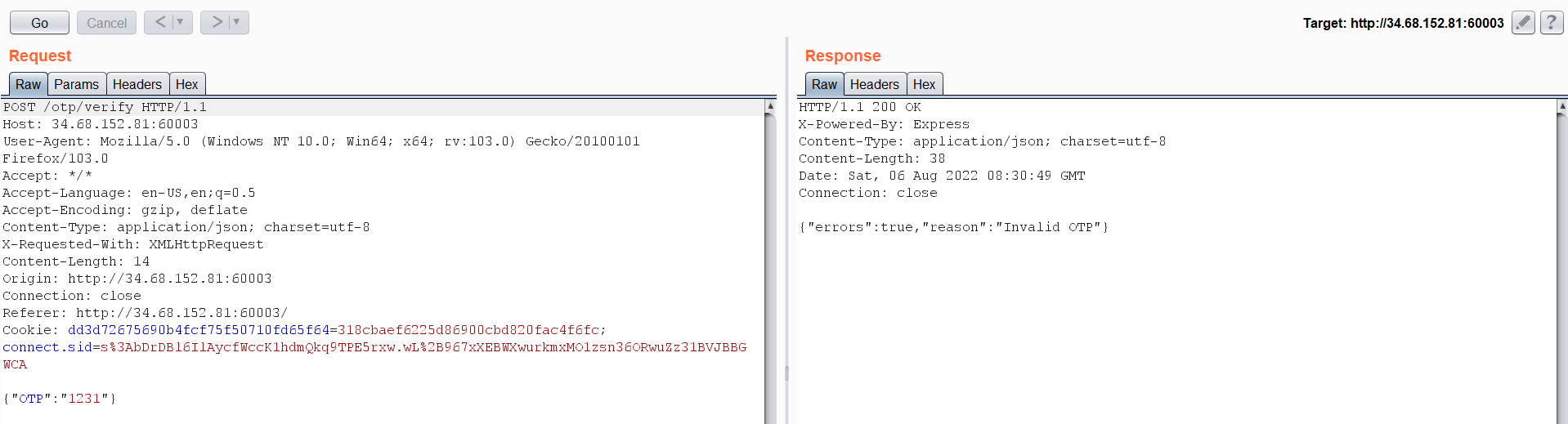 Let’s examine the OTP request in burp suite.