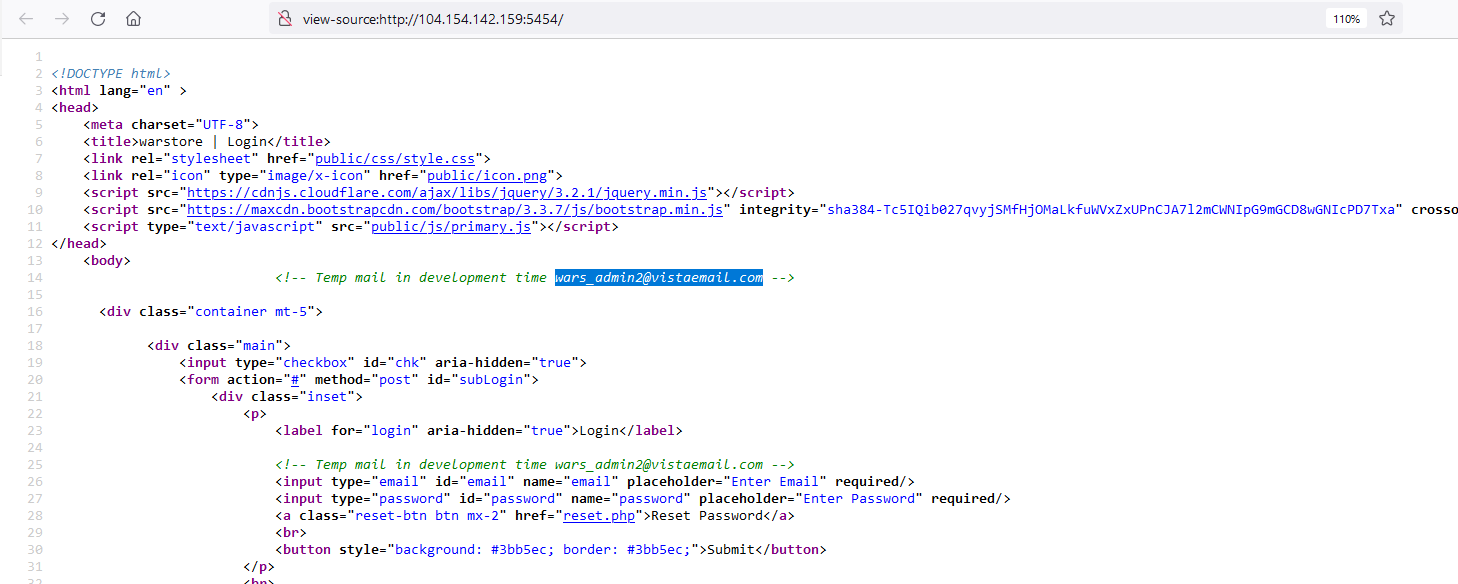 Viewing the page source, we will found an email added in the HTML comments.