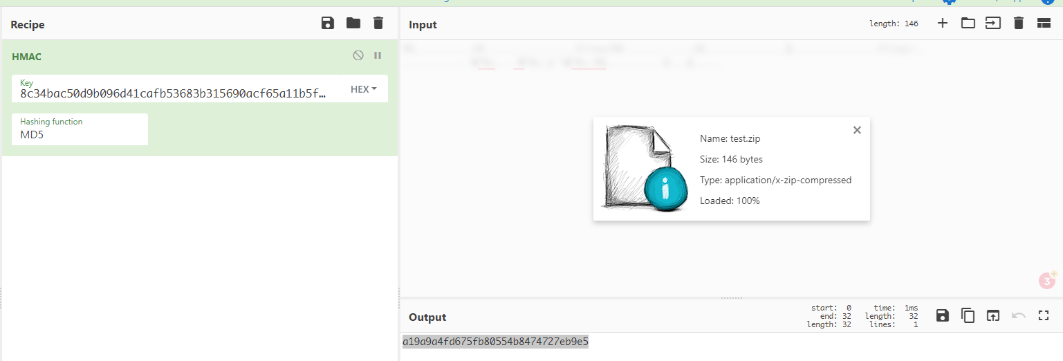 As we saw earlier while trying to upload the file we get “HMAC missing” after some research I found that the uploaded file has to be signed with HMAC key to be validated. So I signed a random file in cyberchef and upload it.