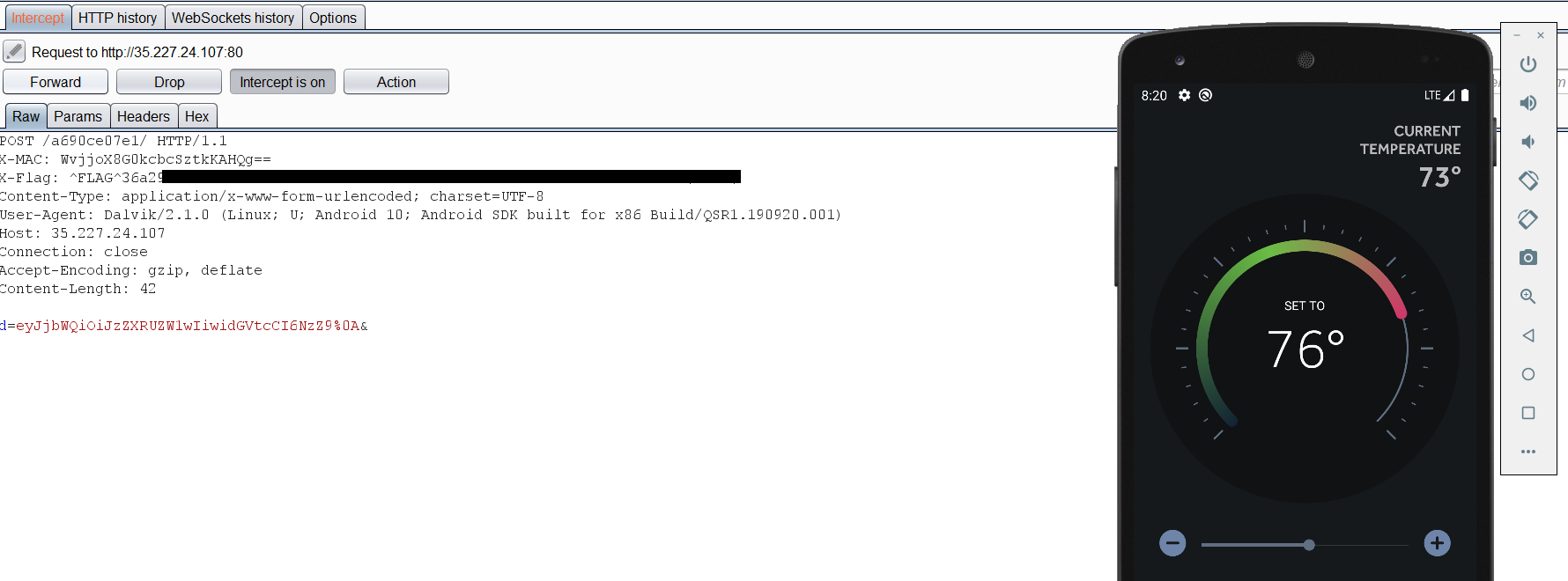 hmm! nothing to be interesting and only a plus and mins button to reduce the temperature. maybe there are some hidden requests. So we need to inspect the traffic through our proxy I will be using burp suite. the following will help to Configuring your Android to Work With Burp: https://www.youtube.com/watch?v=lq4wprdLpbo I configured burp and run the program and the first request was congaing the first flag:
